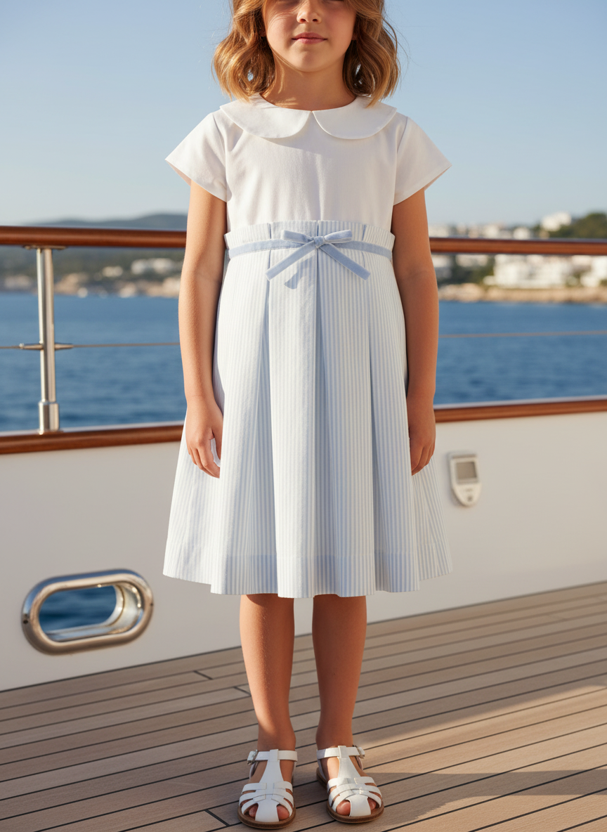 Robe de cérémonie bébé fille avec haut blanc et jupe rayée.